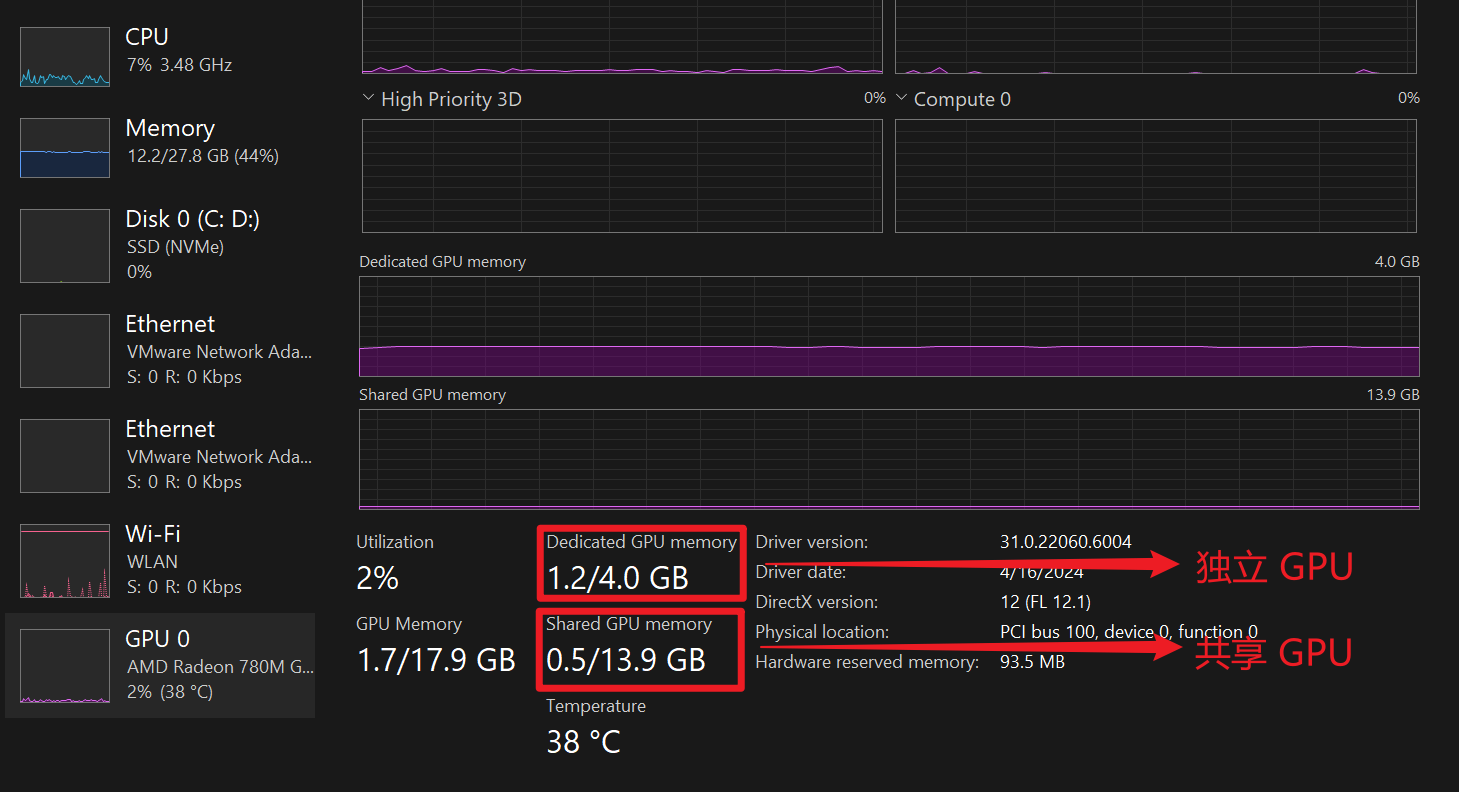 在了解示例电脑的基本信息后,我们打开 Task Manager, 切换到 GPU 一栏,我们可以看到自己 Dedicated GPU 和 Shared GPU 具体大小,如下: