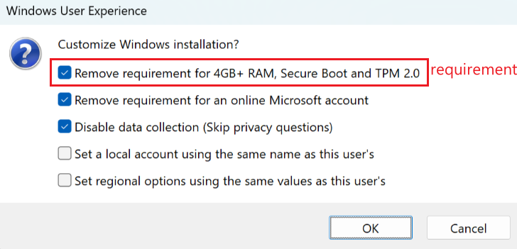 对于体验设置,移除 TPM2.0 模块是必选的,其他可以根据自己情况。如果自己有微软账户,需要和微软账户保持同步,建议不移除微软账户(online microsoft account),反之移除并且创建一个本地账户(local account)。同时,建议将 BitLocker 也移除(最新版有对应选项),BitLocker 加密容易导致数据丢失以及影响读写速度,总体而言弊大于利。